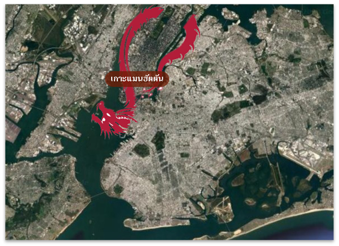 เป็นศูนย์กลางทางการเงินของสหรัฐอเมริกาซึ่งอยู่ด้านทิศตะวันออก หันออกสู่ทะเล ซึ่งเป็นจุดที่เป็นศูนย์รวมของแม่น้ำมารวมกัน ซึ่งถือว่าเป็นศูนย์กลางของพลัง (ตำแหน่งขุมทรัพย์แห่งความร่ำรวย) มีแม่น้ำสามสายวิ่งขนาบข้างเกาะแมนฮัตตันและยังมีเกาะอยู่ปลายสุดปิดช่องทางน้ำอีก (ซึ่งการจะกำหนดตำแหน่งแบบนี้ไม่ใช่เรื่อบังเอิญอย่างแน่นอนและปลายสุดเป็นท้องแม่น้ำเปิด ตรงกลางมีลานเก็บทรัพย์เป็นบ่อน้ำ (อิม) (Central park) สองข้างมีแม่น้ำไหลอย่างต่อเนื่อง (เป็นกระแสเอี๊ยง)และปลายสุดมีแขนสองข้างมาปิดช่องน้ำภายใน และภายนอกอย่างสมบูรณ์ ซึ่งทำให้อเมริกาเป็นศูนย์กลางทางการเงินของโลกมาโดยตลอด