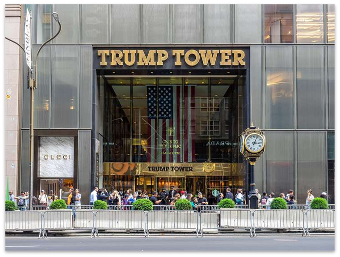 ตั้งอยู่บริเวณเกาะแมนฮัตตันเช่นกัน สร้างขึ้นในปีค.ศ.1980 ตำแหน่งของตัวตึกนั้นหันไปทางสวนสาธารณะพอดี ข้างหน้าตึกเป็นลานโล่ง(เหม่งตึ๊ง) สมบูรณ์ที่สุดซึ่งถือว่าเป็นจุดหนึ่งที่มีพลังที่ดีที่สุดในโลก ก็จะส่งผลให้มีอำนาจ เป็นประธานาธิบดีของประเทศมหาอำนาจ ซึ่งการออกแบบประตูภายในชั้นล่างนั้น เปิดรับพลังแสงสว่างและที่สำคัญ มีนาฬิกาที่สวยงามอยู่ด้านหน้าฝั่งมังกร ซึ่งตรงกับคำที่ว่า( เวลาเป็นเงินเป็นทองลาภผลเพิ่มพูนทวี ) ซึ่งทรัมป์เองห้องทำงานได้อยู่ชั้นที่ 68 แต่กฎหมายของนิวยอร์คนั้น ให้สร้างตึกได้เพียงแค่ 60 ชั้นเท่านั้น ก็เลยได้แก้เคล็ดด้วยการเปลี่ยนชั้นที่อยู่นั้นเป็นชั้น 68 เพราะ 6 คือธาตุทอง ซึ่งเป็นธาตุประจำตัวของทรัมป์นั่นเอง ทรัมป์อาศัยอยู่ที่นี่มาตลอด 30 ปี ซึ่งปีค.ศ.2016 ทรัมป์ได้ถูกเลือกให้เป็นประธานาธิบดี คนที่ 58ของประเทศพอดี แล้วท่านทั้งหลายคิดว่าทรัมป์นั้นจะได้เป็นประธานาธิบดีคนต่อไปหรือไม่...