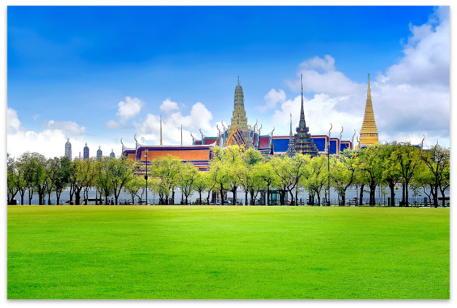 มีการสร้างออกแบบด้วยสถาปัตยกรรมที่สวยและงดงามอย่างมาก มีสนาม ลานเก็บพลังภายใน ด้านนอกมีสนามหลวงเป็นลานกลางซึ่งเป็นพลังภายนอก มีกระแสแม่น้ำเจ้าพระยาโอบอุ้มฝั่งมังกร แม่น้ำมีความอ่อนช้อยอ่อนโยน พลังจะยืนยาว นี่คือเหตุผลที่ทำไมพระพุทธศาสนาไม่ได้เกิดที่ประเทศไทย แต่มีความเจริญรุ่งเรืองอย่างมาก และจะรุ่งเรืองตลอดไปตราบนานเท่านาน เพราะตำแหน่งที่ตั้งนั้นถูกต้องและสอดคล้องกับหลักของชัยภูมินั่นเอง