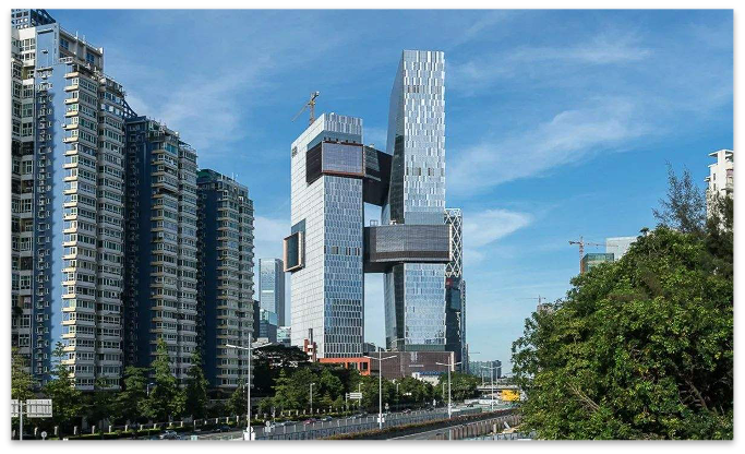 รูป ตึกหอคอยคู่ Vertical Campus ซึ่งเป็นสำนักงานใหญ่ของบริษัทที่มีมูลค่าและร่ำรวยที่สุดของจีนในเวลานี้อย่าง Tencentผู้พัฒนาโปรแกรมแชทยอดนิยมของคนจีนอย่าง WeChat