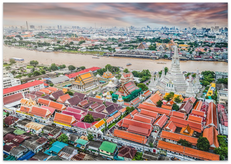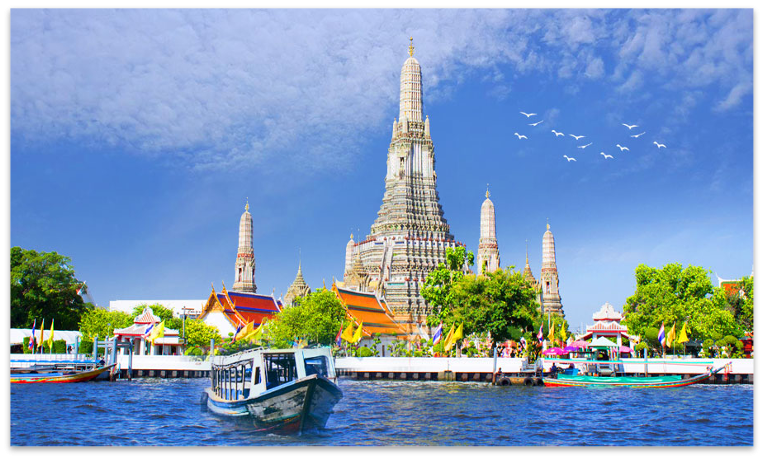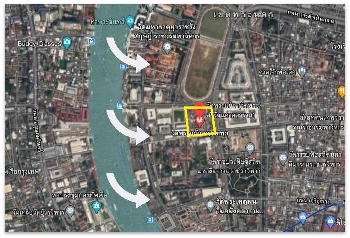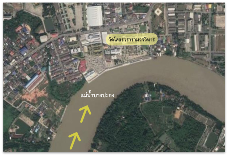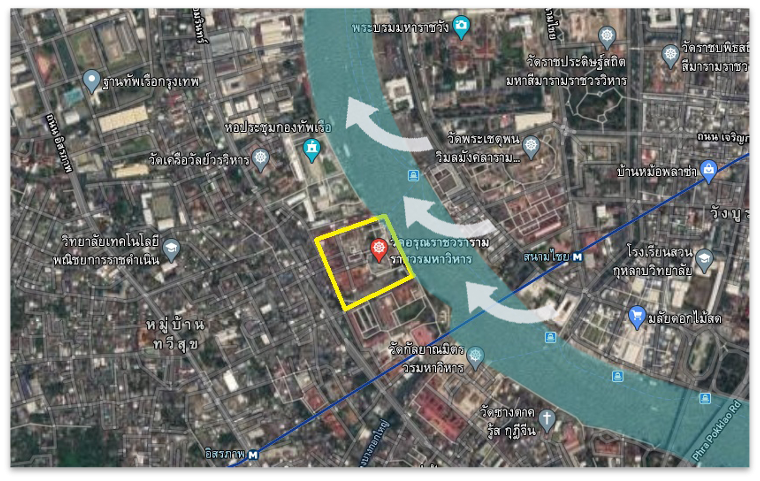 รูปแสดงตำแหน่งที่ตั้งวัดอรุณราชวรารามฯ ที่มองเห็นกระแสแม่น้ำไหลแต่ไกล
